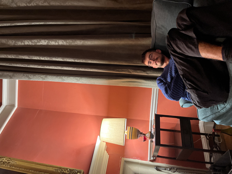 A man in glasses and a blue sweater reclines on a teal couch, dark trousers on his lap. Behind him hang textured beige curtains above a coral-colored wall. A lamp with a beige shade rests on a black side table, along with a wine bottle and a half-full glass of red wine. Ornate white molding frames the window and the room's baseboards. A gilded picture frame lies on the floor.