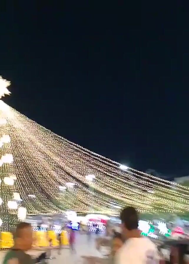 The video depicts a night scene in what appears to be a town square or public gathering space. The focal point is a large, illuminated structure resembling a Christmas tree, decorated with numerous strings of lights culminating in a star at the top. Several people are walking around the area near the base of the "tree", suggesting pedestrian activity. Street lights are visible and there is a hint of buildings in the periphery, contributing to the overall ambience. The sky is dark, adding to the nighttime setting.