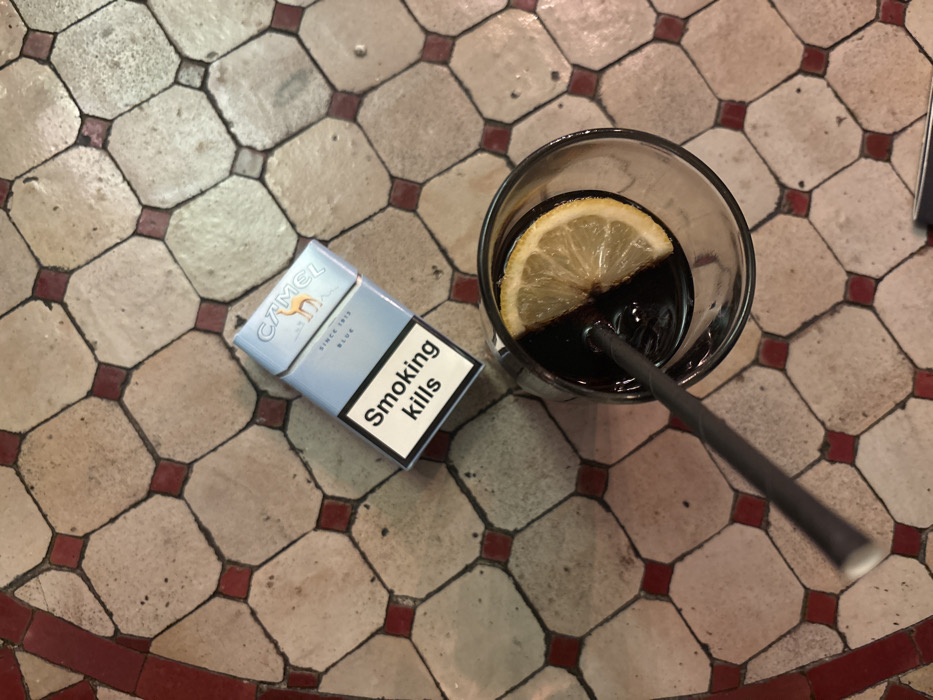- "An overhead shot features a pack of Camel Blue cigarettes with a "Smoking kills" warning label, next to a glass filled with dark liquid, a lemon wedge, and a black straw" by FM-Dojp23, licensed under CC BY 4.0