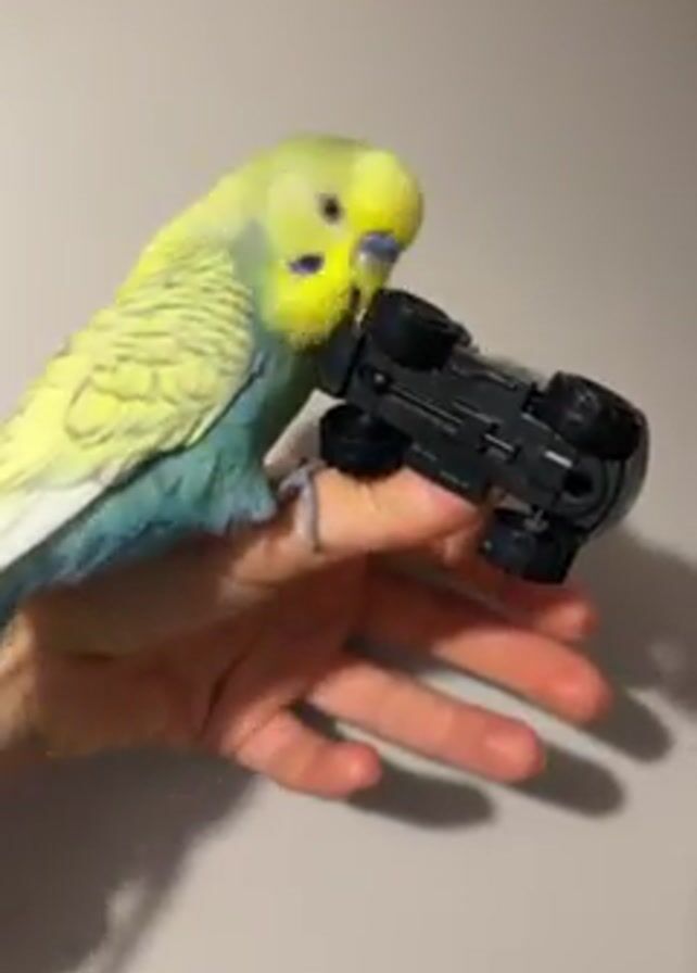 - "A small, yellow-and-blue parakeet sits on a person's finger, pecking at a small black toy car" by FM-rE8HA3, licensed under CC BY 4.0