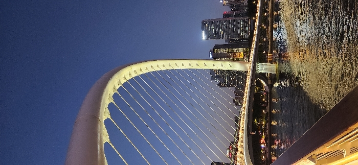The image depicts an urban nighttime scene in Yuexiu District, China, showcasing a prominently lit bridge spanning a body of water. A large, white or light-colored arch structure of the bridge dominates the upper and central left portion of the frame, curving upwards and to the right. Numerous diagonal, thin cables (hangers) extend from the illuminated underside of the arch down to the bridge deck. The arch and the entire length of the visible bridge deck are extensively illuminated with bright yellow-white artificial lights, clearly defining its structure against the dark blue twilight sky. Below the bridge, a dark river surface is visible, showing ripples and reflecting the yellow-white lights from the bridge and city, creating streaks of illumination on the water. In the background, on the far bank of the river, a dense cluster of modern high-rise buildings forms a city skyline. These buildings are also illuminated, with internal lights visible through windows, contributing to the urban glow. A single bridge pier is visible in the water supporting the bridge structure. In the lower left foreground, a dark, angled railing or edge of another structure is present, suggesting the vantage point is from an adjacent platform or vessel. No individual people or vehicles are distinctly identifiable, though the illuminated bridge deck implies activity. The overall environment is characterized by extensive artificial lighting in an urban setting.