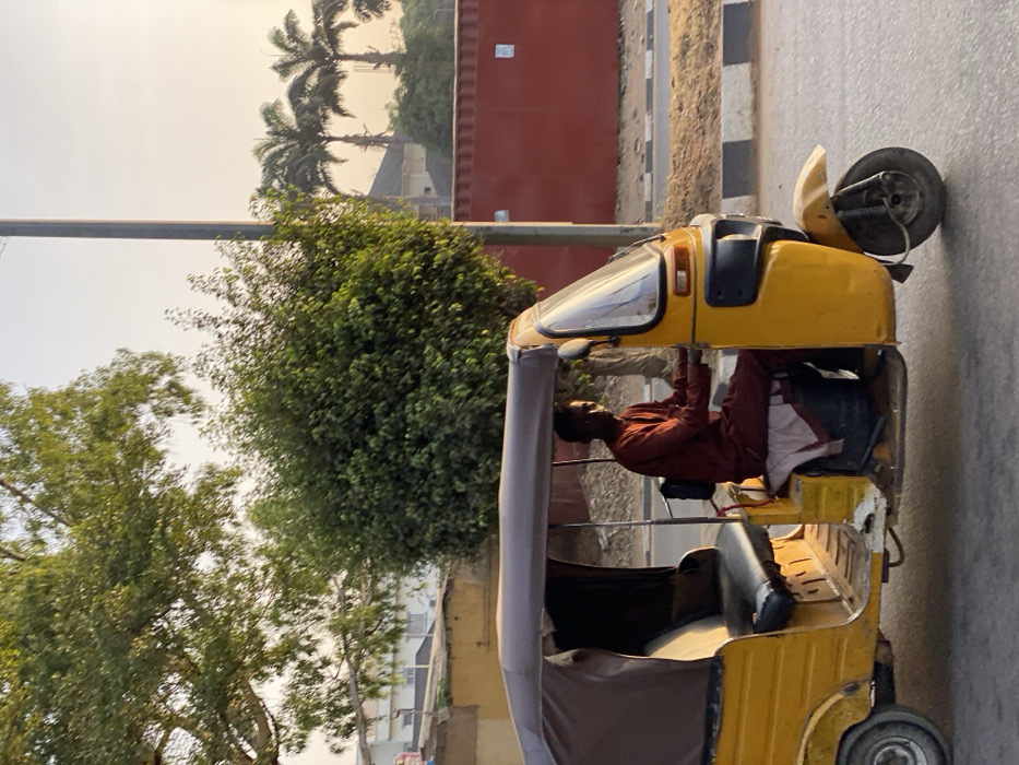 A yellow auto-rickshaw with a driver in a red shirt sits on a paved road. Trees with green foliage and palm trees are visible in the background. A red building is partially visible to the right. A gray metal pole is present. The image is rotated to the side.