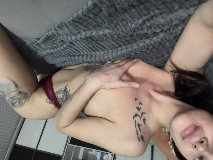 A female subject is depicted reclining on her left side on a grey, textured blanket within an indoor room in the city of Unknown, Unknown. She faces partially towards the camera, revealing the lower half of her face with full lips, and dark hair on the left side of her head. Her upper torso is bare. A black silhouette tattoo of birds in flight is visible on her left clavicle and shoulder. Her right hand is positioned over her left breast. She wears dark red lace thong underwear. Additional tattoos include a colorful figure on her left ribcage/hip, an avian creature on her right thigh/hip, and intricate patterns on her partially visible left forearm. In the background, a white and grey wardrobe or shelving unit is visible, with a white cylindrical object placed on an internal shelf. The room is illuminated by ambient light.