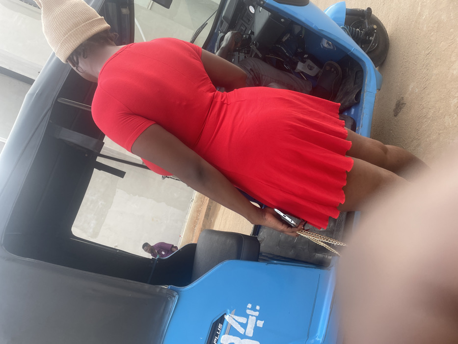 A person in a red dress and light tan beanie stands next to a blue auto rickshaw. The person is holding a cell phone and a purse with a gold chain strap. A driver sits inside the auto rickshaw. A person in a purple shirt is visible through the window of the auto rickshaw. The photo is taken at an angle, with a hand partially obscuring the right side of the image.