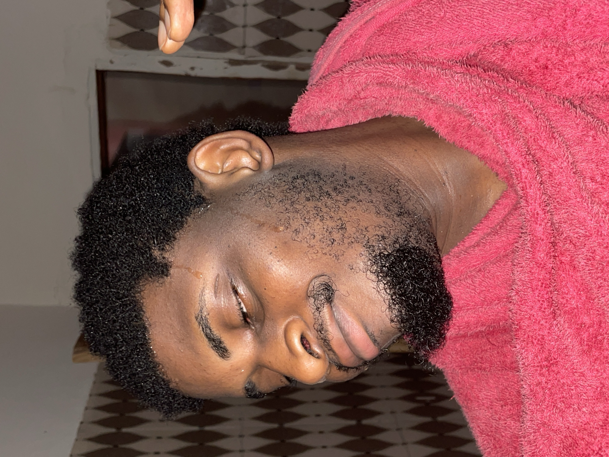 The image depicts a close-up portrait of an adult male in an indoor setting. The male has dark skin, short dark curly hair, a dark mustache, and a dark beard. His eyes are closed or heavily lidded, and his mouth is slightly open. Water droplets are visible on his forehead, eyelashes, and beard, indicating wetness. He is draped in a bright pink terry cloth towel, which covers his shoulders and upper chest. The background features a tiled wall with a diamond pattern in alternating brown and white or light grey hues. In the upper right background, a vertical light-colored strip, consistent with a doorframe or wall edge, is visible. The specific location within the city of Akwanga, Nigeria, cannot be determined from the visual evidence presented.