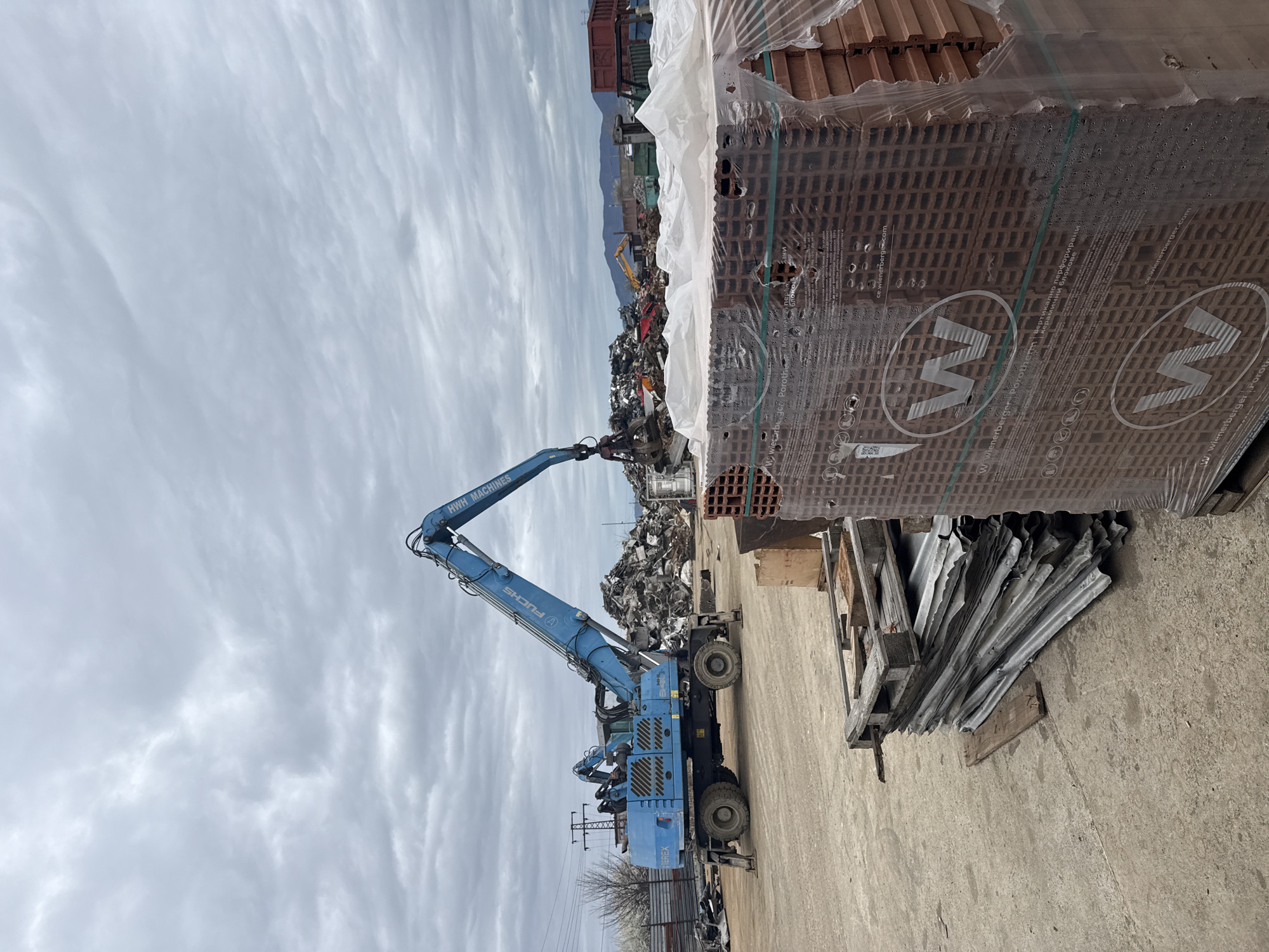 n outdoor industrial setting, likely a scrapyard or construction supply yard, under a cloudy sky