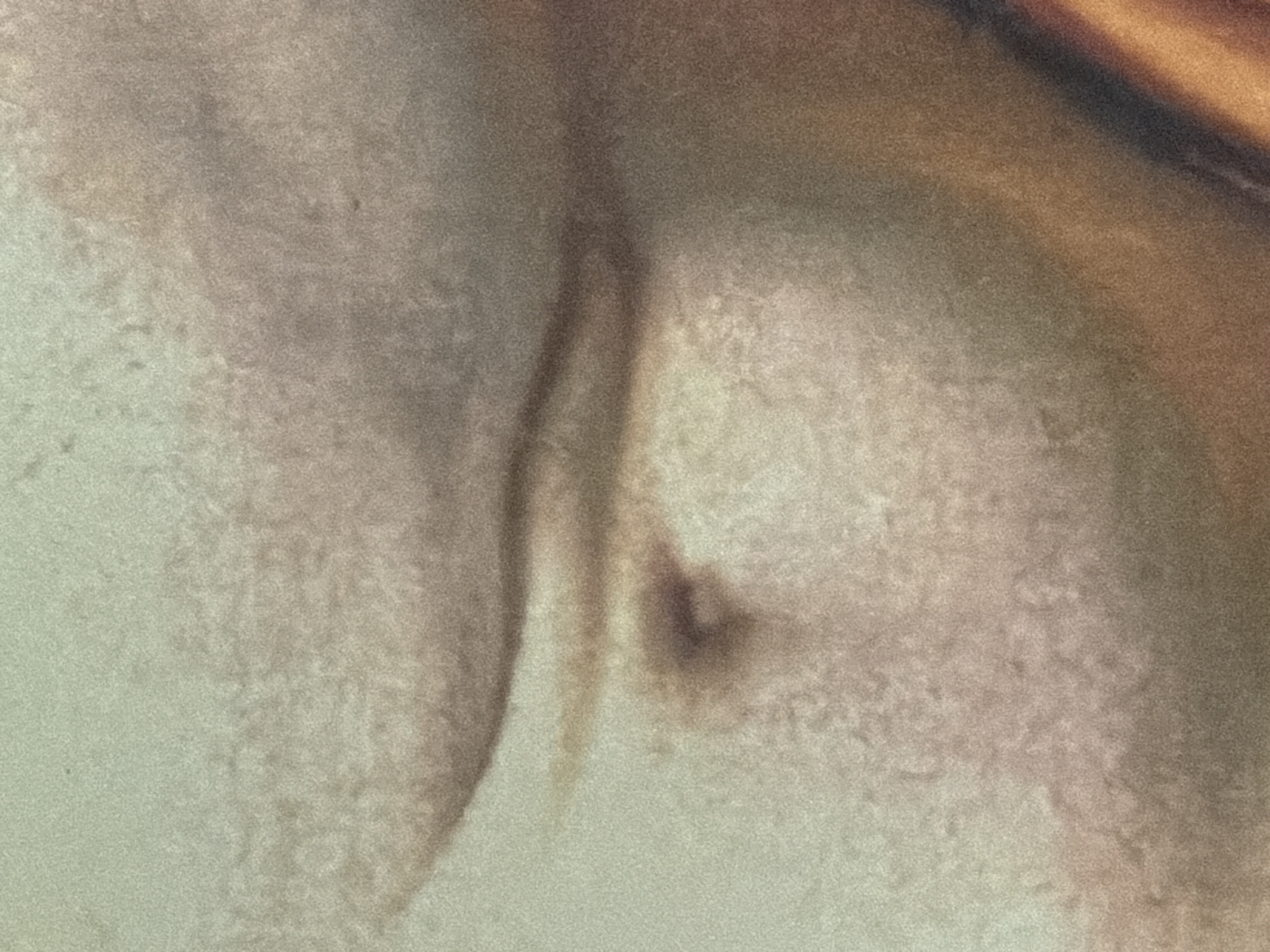 This image is a detailed, forensic close-up of a section of an oil painting on canvas, specifically depicting the lower abdomen of a human figure. The central feature is a human navel, appearing as a dark, recessed, oval shape. Immediately above the navel, a prominent horizontal fold in the skin is clearly visible, indicative of the natural contour of the torso. The surrounding skin is rendered with subtle color variations, primarily in muted tones of pale beige, cream, and reddish-browns, with faint greenish undertones. The surface exhibits a granular texture and fine cracks, consistent with craquelure and the aging of an oil painting. To the lower right, a warmer, darker, and diagonally oriented area is visible, suggesting drapery or a deep shadow within the broader composition. This detail is from the painting **"Saint Sebastian" by Giulio Cesare Procaccini**, located in the **Pinacoteca di Brera, Milan, Italy**. The original artwork depicts Saint Sebastian, an implied male figure, tied to a tree with his torso exposed, fitting the context of this anatomical detail.