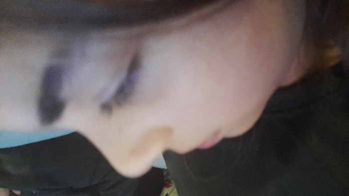 A close-up, angled view of a person's face, primarily focusing on the side profile. The nose, closed eye with dark shadow, and part of the mouth are visible. The skin appears fair. Dark clothing frames the face, with a hint of light blue or green fabric in the background. The image appears slightly blurry or unfocused, particularly in the details of the eye and clothing.
