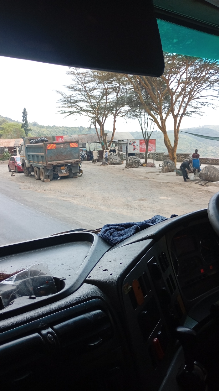 The image, taken from the interior of a vehicle in Lari/Kirenya ward, Kenya, provides a view through the windshield