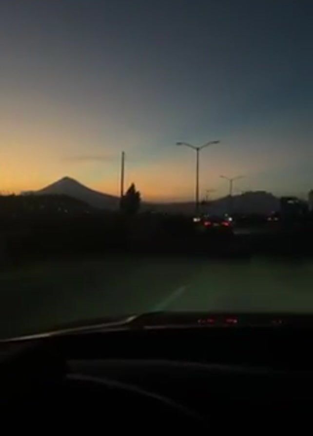The video, taken from inside a car moving on a road at dusk or dawn, shows the view through the front windshield