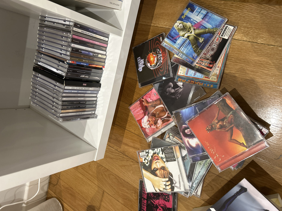 The image displays a collection of CDs scattered on a wooden floor and neatly stacked on a white shelf
