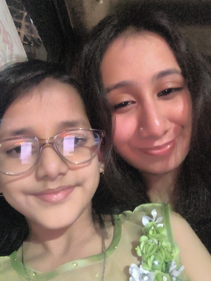 A selfie captures a woman and a young girl, both smiling gently at the camera. The girl wears glasses with a noticeable reflection, along with small hoop earrings. Both are dressed in light green attire. The woman has a nose ring. The overall image has a slightly blurred effect, possibly due to low lighting conditions.