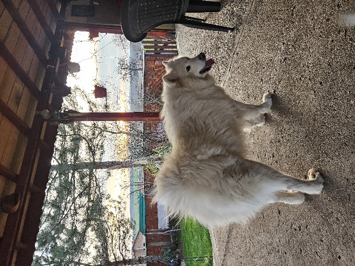 - "A cream-colored, long-haired dog, resembling a Samoyed, stands on a textured concrete surface under a wooden pergola roof structure" by FM-kiop82, licensed under CC BY 4.0