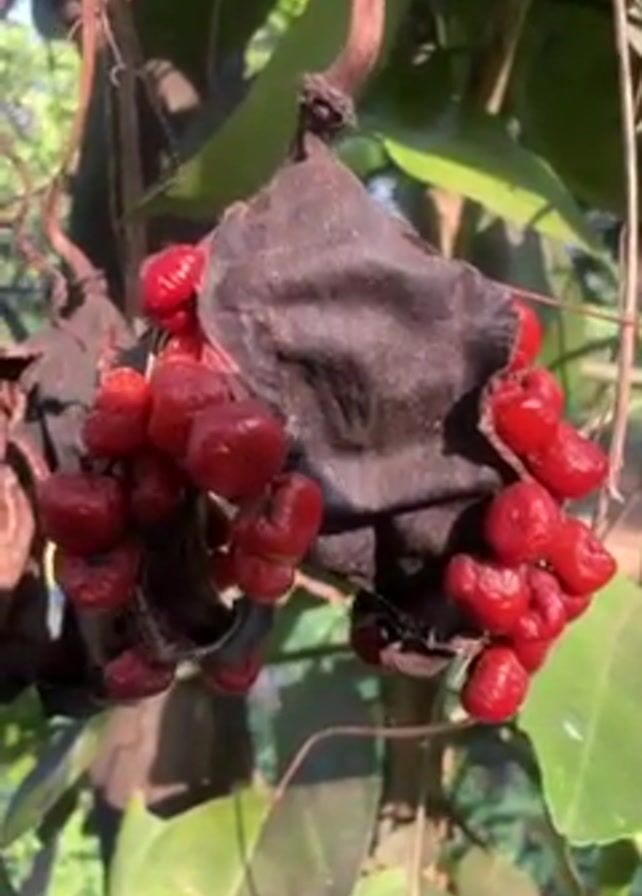 The camera focuses on a cluster of bright red, berry-like fruits hanging on a vine. These fruits are attached around a dark brown, withered structure that seems to be the remnant of a dried leaf or flower casing. The vine itself is slender and brown, with green leaves also visible in the background, providing a natural, outdoor setting. The scene is lit by natural sunlight.
