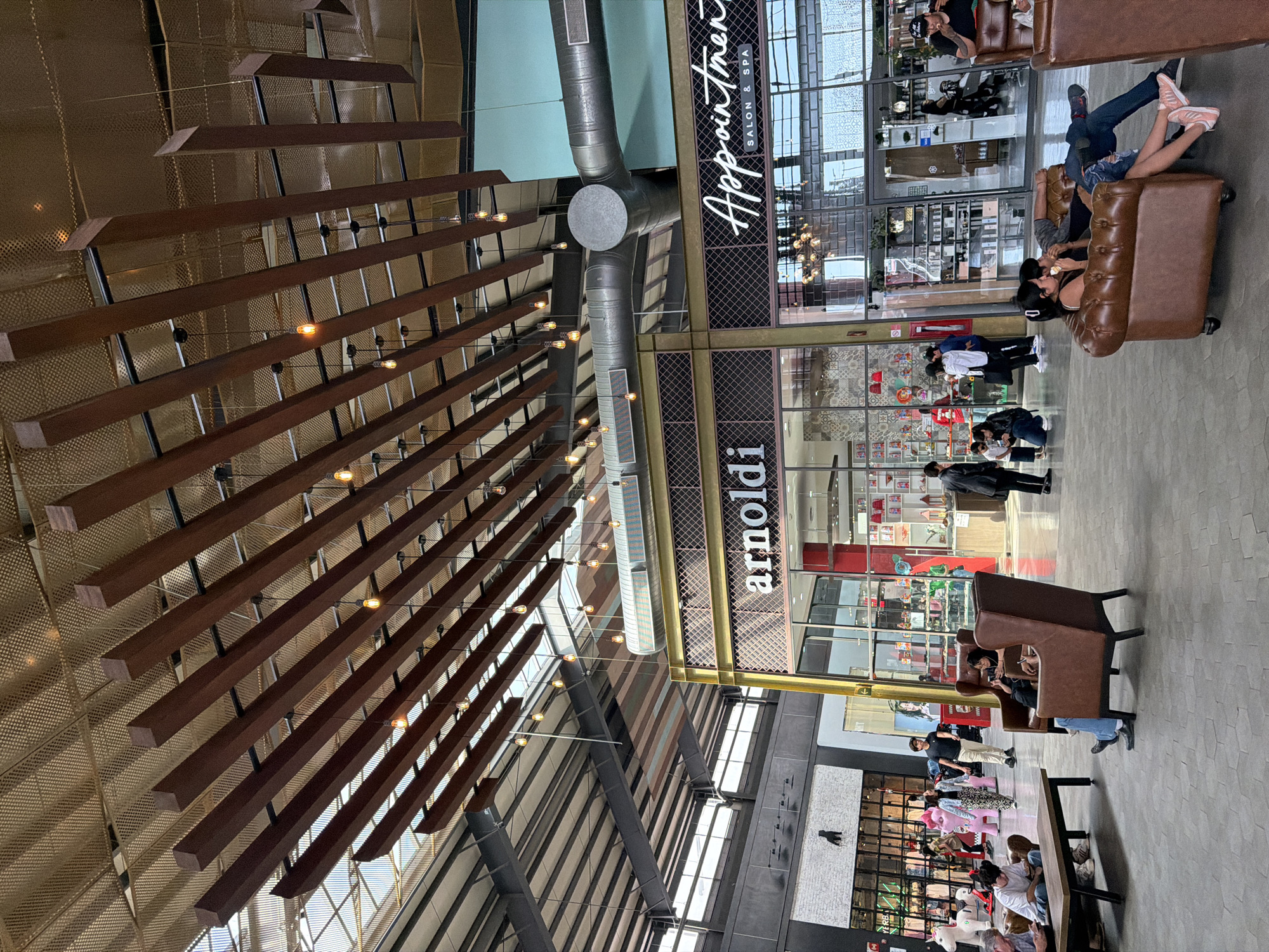 The interior shot depicts a modern commercial space, potentially a shopping mall, located in San Pedro Cholula, Mexico, as suggested by the signs visible. The architecture features exposed industrial elements such as silver ductwork and a high, angled metal roof. A decorative installation of suspended wooden beams, interspersed with small light fixtures, dominates the upper portion of the frame. The businesses "Appointment Salon & Spa" and "arnoldi" are visible through large glass windows. People are seated on brown leather sofas, engaging in conversation. Others are standing or walking within the mall space. To the right, individuals are seated at a table. The overall atmosphere suggests a relaxed and social environment within a commercial setting.