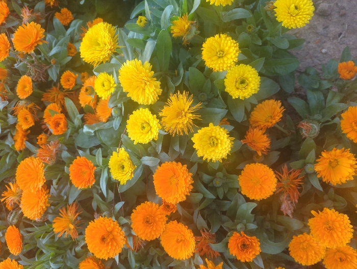 The image presents a dense, top-down view of numerous blooming flowers in varying shades of bright orange and yellow, situated in Da Lat, Vietnam. The flowers are tightly clustered, obscuring most of the underlying ground, though a small area of light brown soil is visible in the lower right portion of the frame. Dark green foliage with visible veins is interspersed among the blossoms. The flowers exhibit multiple layers of petals, characteristic of marigolds or calendulas, with some appearing more compact and spherical while others display a more open, daisy-like form. No individuals, animals, specific actions, or interactions are depicted in the scene.