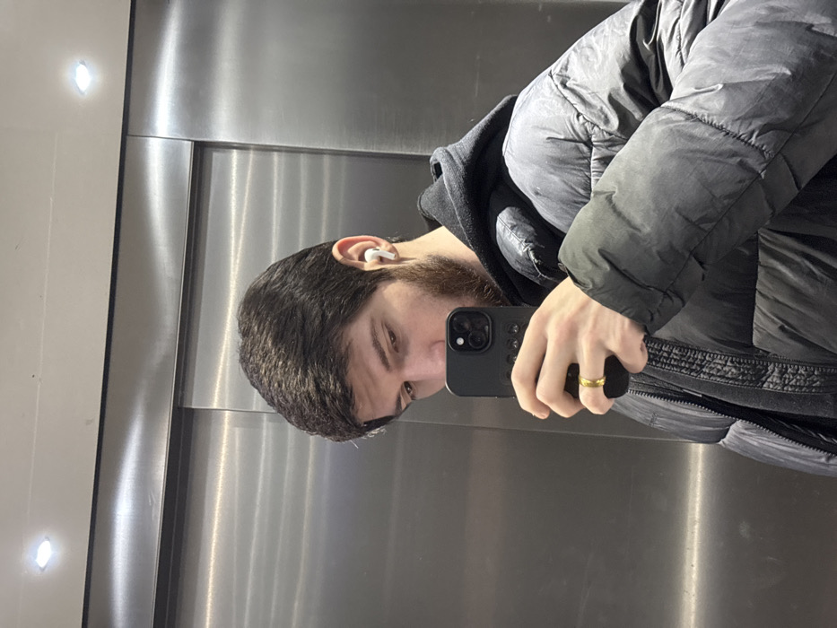 A man takes a mirror selfie in an elevator. He holds a smartphone with his right hand, on which he wears a gold ring. He sports dark hair and a trimmed beard, with a wireless earbud in his right ear. He's dressed in a black puffer jacket with a visible hoodie underneath. The elevator has metallic walls with a light fixture visible at the top. The image is oriented vertically.