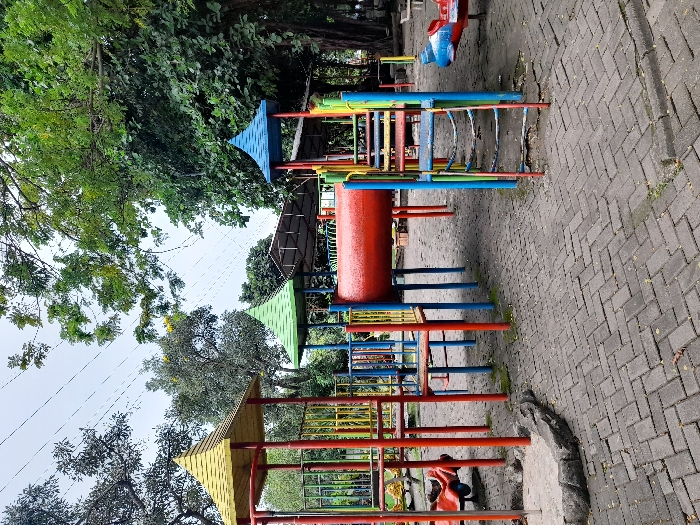 n empty playground in Kecamatan Sidoarjo, Indonesia, located at coordinates -7.441 latitude and 112.705 longitude. The playground is made of colorful metal and features a slide, a climbing structure, and a tunnel. The playground is surrounded by trees and paved with gray brick. The metal structure is yellow, blue, red, and green. There is a red metal tunnel. There is a red toy car on the ground. The playground is empty with no people present.