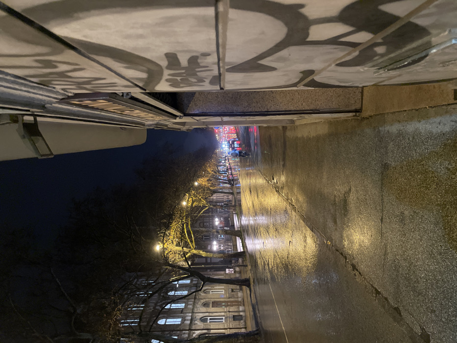 The image depicts a nighttime urban scene on a wet street in Novi Sad, Serbia, likely Bulevar Mihajla Pupina, looking down the boulevard. The perspective is from the sidewalk on the right side of the street, looking diagonally forward and left. In the immediate foreground on the right, a light-colored building facade is visible, heavily covered with large, dark graffiti, including the word "PUNK." An awning extends from this building, beneath which a shop sign clearly displays "SLOVENSKA REVOLUCIJE." The concrete sidewalk is dark and reflective due to wetness. To the left of the sidewalk, a wide asphalt road stretches into the distance, reflecting the warm yellow glow of numerous streetlights and the red and white lights of distant vehicles. The road appears to be a multi-lane thoroughfare. In the middle distance, a single individual is observed cycling a bicycle away from the camera, wearing a light-colored jacket. On the left side of the street, a row of tall, bare deciduous trees lines the thoroughfare, positioned between the road and a line of buildings. Streetlights, emitting a warm yellow light, are mounted within this tree line. Behind the trees, a prominent multi-story building stands, characterized by a darker ground floor and three upper floors each featuring a series of uniformly arched windows with white frames, indicative of early 20th-century architecture. Further down the street, additional buildings and the blurred lights of more vehicles are visible. The sky is dark and clear, suggesting a cloudless night. The overall environment is illuminated by artificial lights, creating strong reflections on all wet surfaces. The scene conveys a quiet, post-precipitation urban night.