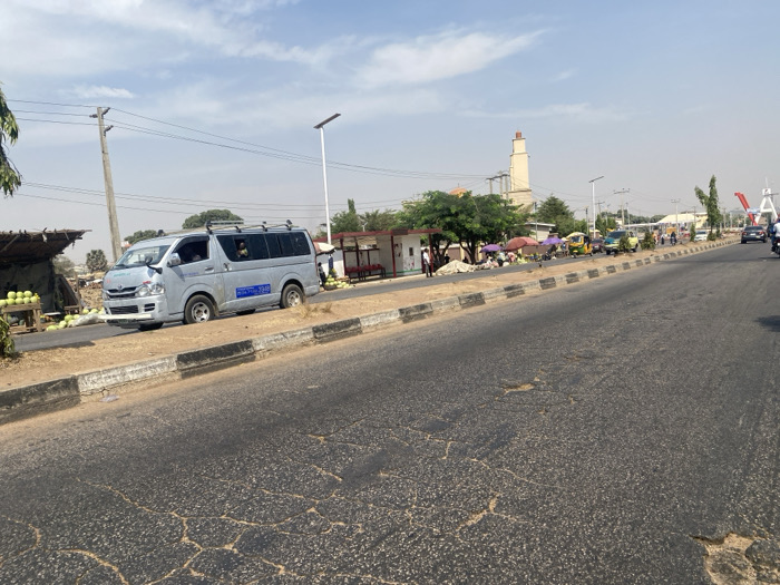 This image captures a daytime street scene in Barnawa, Nigeria. The foreground features a two-lane asphalt road characterized by extensive surface cracking and visible potholes. A raised curb, marked with alternating black and white paint, separates the road from the unpaved shoulder. On the left side of the road, a silver Toyota Hiace passenger van, equipped with a roof rack, is parked or stationary on the dirt shoulder. A person is visible through an open window on the van's side. Adjacent to the van, a makeshift market stall, constructed with a rustic roof, displays numerous green, spherical fruits (consistent with watermelons) piled on the ground and within the stall structure. Multiple wooden utility poles with overhead electrical wires and a tall solar-powered streetlight are also present on this side. The right side of the road reveals a vibrant commercial strip extending into the background. Several market stalls, some featuring colorful umbrellas, are active with individuals engaged in commerce. Multiple three-wheeled auto-rickshaws (Keke Napep) in yellow and green are present, along with other motor vehicles further down the road. A prominent light-colored minaret, part of a mosque, with a distinctive conical top, stands tall above the surrounding low-rise buildings in the mid-background. A large white structure with red components is visible further in the distance on the right. Numerous pedestrians are observed walking and congregating around the market stalls. The sky is clear blue with scattered white clouds, indicating bright daylight conditions.