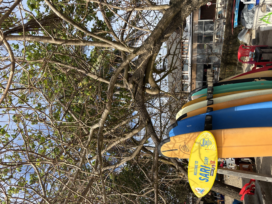 The image depicts an outdoor scene in Kuta, Indonesia, featuring a surf rental or lesson operation. Eight surfboards are vertically positioned on a black rack on sandy ground, with their fins facing away from the viewer. From left to right, the visible surfboards are yellow, orange, blue, light beige, light green, dark green, and red. A yellow oval sign, attached to the front-most yellow surfboard, displays "WELCOME TO SARI SURF" along with logos for "Banana Boat" and "E-CRAFT." The upper two-thirds of the frame are dominated by the extensive, interwoven branches of large trees, exhibiting sparse green foliage against a clear, light blue sky. Below the tree line and behind the surfboards, a multi-story building with a dark, pitched roof and large windows is visible, partially obscured by a low brick wall. To the immediate right of the surfboard rack, a red plastic chair and a small dark table with a light-colored object on it are present on the sand. Another red plastic chair and a wooden support structure are visible to the left of the surfboards. No individuals are clearly depicted within the frame. The scene is illuminated by natural daylight.