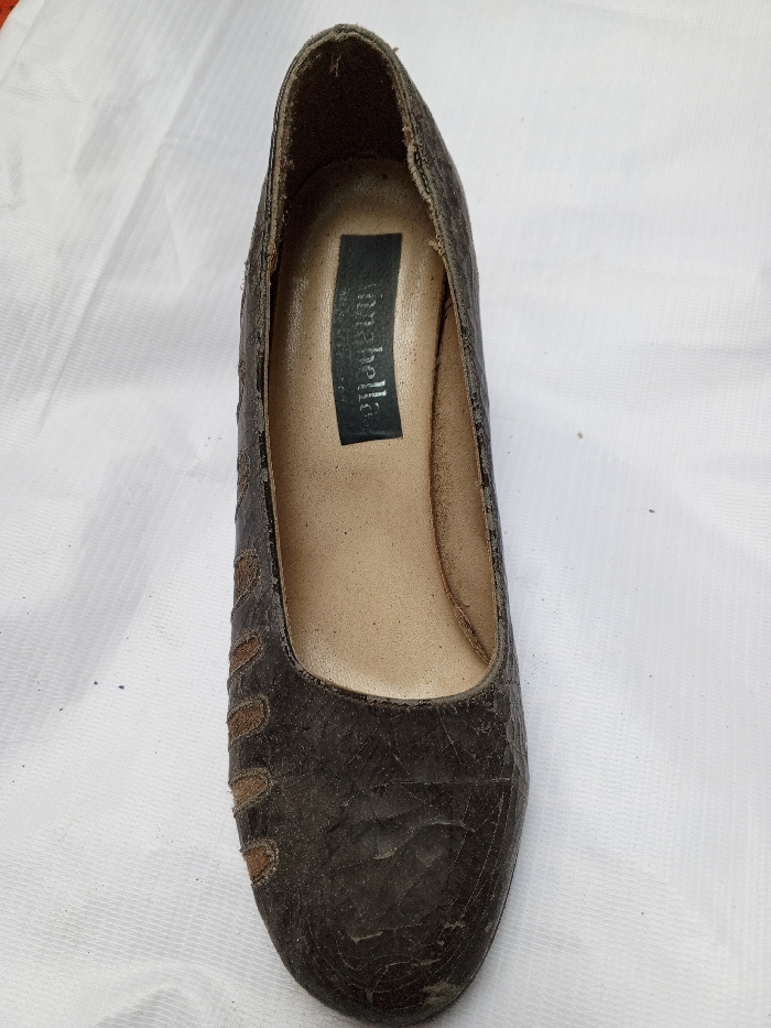 - "A used, dark brown, leather-like women's pump is centered in the image" by FM-Z0D4I2, licensed under CC BY 4.0