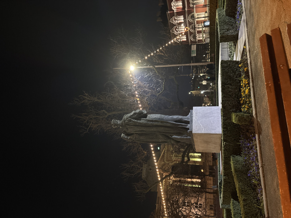 The image presents a nighttime street-level view of the Monument to Saints Cyril and Methodius, located in a public square in front of the National Library of Bulgaria "St. St. Cyril and Methodius" and the Sofia University Rectorate in Sofia, Bulgaria. In the midground, the central subject is a large, dark-colored bronze statue depicting two figures in long robes, viewed from behind, standing on a prominent light-grey rectangular stone pedestal. The figures face towards the right side of the frame. Surrounding the monument base is a low, green, trimmed hedge forming geometric patterns, with small purple and yellow flowering plants visible within the enclosed garden beds. A brown wooden park bench is partially visible in the bottom foreground. To the left of the monument, a large building with classical architectural elements, including columns and multiple windows, is partially illuminated by warm-toned uplighting, identifying it as the National Library of Bulgaria. To the right of the monument, a distinct red-brick building with numerous arched windows and lighter decorative trim, identified as the Sofia University Rectorate, is also illuminated. A tall, dark street light pole stands to the right of the monument, emitting a bright, warm-toned light. Strands of small, warm-colored string lights are strung diagonally across the upper midground, appearing to connect between trees or poles. Bare deciduous tree branches are silhouetted against the dark, clear night sky above the buildings and monument. Several indistinct figures are visible in the background, near the base of the Sofia University Rectorate. The scene is entirely illuminated by artificial light sources.