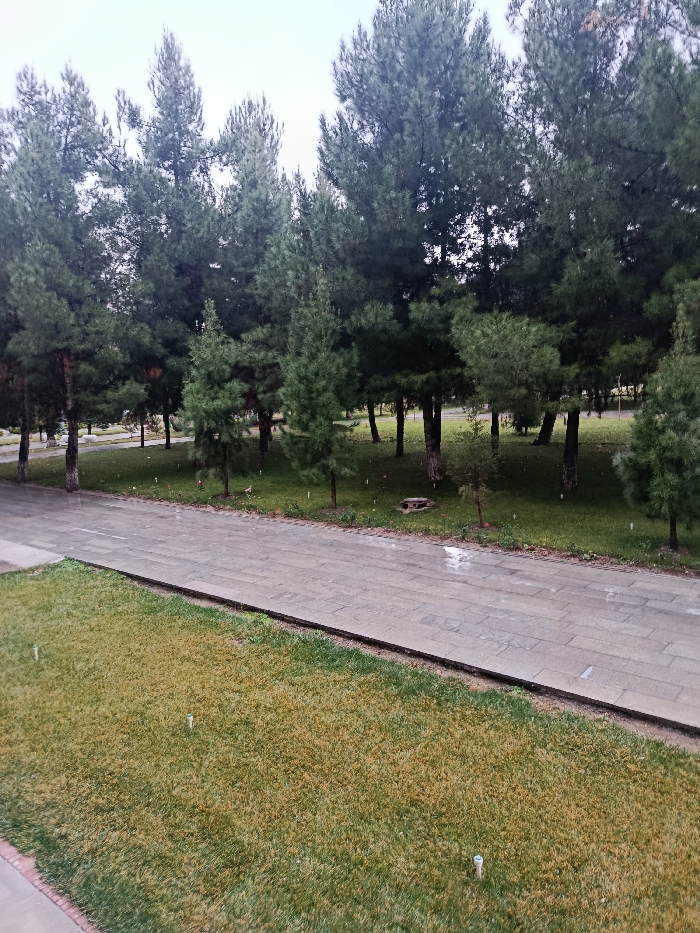 The image displays an outdoor park or landscaped area in Samarkand City, Uzbekistan, under an overcast sky. The environment shows evidence of recent precipitation, with wet surfaces visible. In the foreground, a strip of green and yellowing grass contains two small, white, cylindrical objects embedded in the turf. This lawn borders a gray paved pathway, constructed from rectangular stone slabs, which runs horizontally across the midground. The pathway surface is visibly wet, reflecting light. Beyond the pathway, a second strip of green grass is present, scattered with small, light-colored debris. This area is backed by a dense stand of coniferous trees, predominantly pines, varying in height and maturity. Their dark trunks are visible, and the foliage is green. Glimpses of additional green space or paved areas are discernible through the trees in the distant background. No people, animals, or vehicles are observed within the scene.
