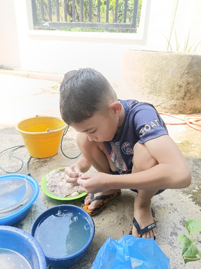 An outdoor scene in Teupinjok, Indonesia, depicts a young male individual, appearing to be a child, squatting on a concrete surface. He has short dark hair and is wearing a dark blue short-sleeved t-shirt with a "Paris Saint-Germain" club emblem and "GOAT" text, along with black and orange flip-flops. The child is actively engaged in handling organic matter, possibly fish entrails, with both hands from a light green plastic plate positioned directly in front of him. Surrounding the child are several objects on the concrete ground. To his left, there are three blue plastic bowls containing clear water; one bowl holds a fish partially submerged. A yellow plastic bucket containing water and a dark rope or hose is situated further back to the left. A light blue plastic bag rests on the ground in the lower right foreground, near a small green plant. An orange garden hose is coiled on the ground to the far right. The background features a light-colored wall, above which a black metal fence or railing is visible. Beyond the fence, green foliage is discernible. To the far right, a cylindrical concrete structure, possibly a well or large planter, is present. The scene is illuminated by natural daylight.
