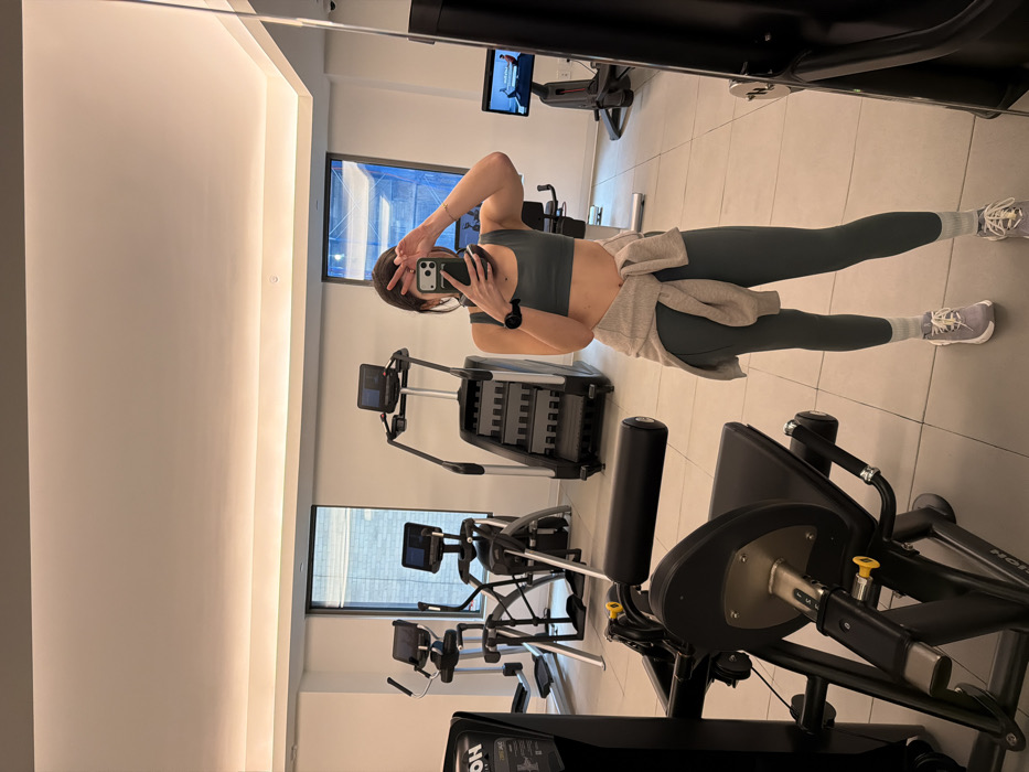 An image captures a full-body mirror selfie taken inside a modern gym located in an urban environment, consistent with the city of New York, United States of America