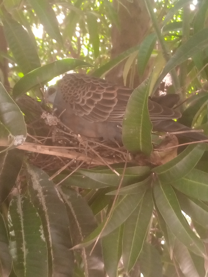 - "A single Spotted Dove (Spilopelia chinensis) is observed stationary within a rudimentary nest constructed from dry twigs" by FM-8GuDv1, licensed under CC BY 4.0