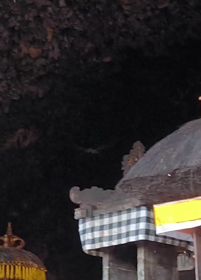 interior of a dark cave with a Hindu shrine at the bottom, illuminated by soft light. The shrine is comprised of multiple tiered structures with traditional Balinese decorations, including a thatched roof with a golden crown-like ornament, checkered fabric, and gold trim. Bats can be seen flying in and out of the cave, contributing to the shadowy atmosphere. The top of the frame reveals green vines hanging from the cave ceiling, adding a touch of nature to the scene.