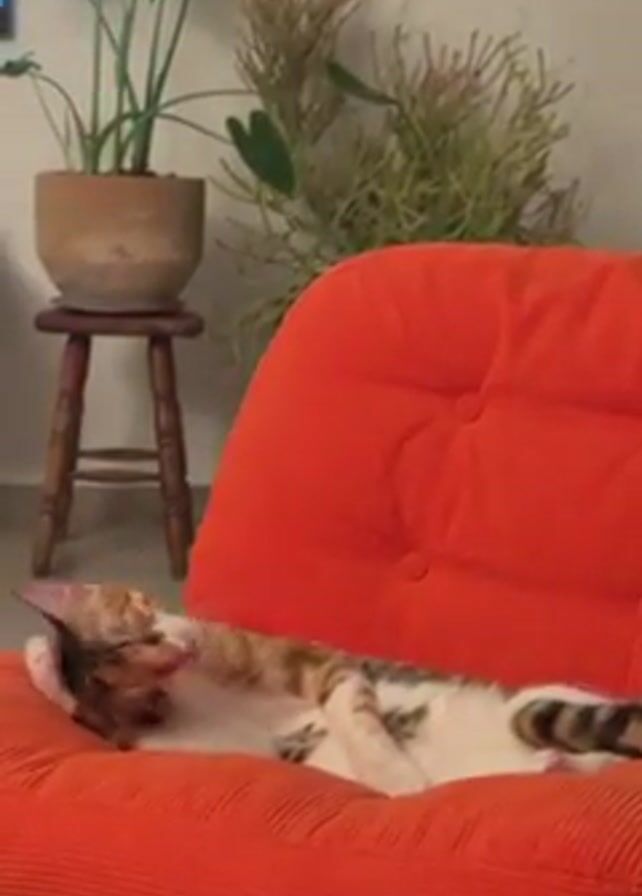 Certainly! Here's a concise description of the video: The video shows a tabby cat lying on its back on an orange corduroy chair, grooming itself. The cat is mostly white with patches of brown and black fur. In the background, there are two plants, one with large, green leaves and another with smaller, spiky green foliage. A wooden stool is positioned beneath the first plant. The background is a room with light-colored walls.