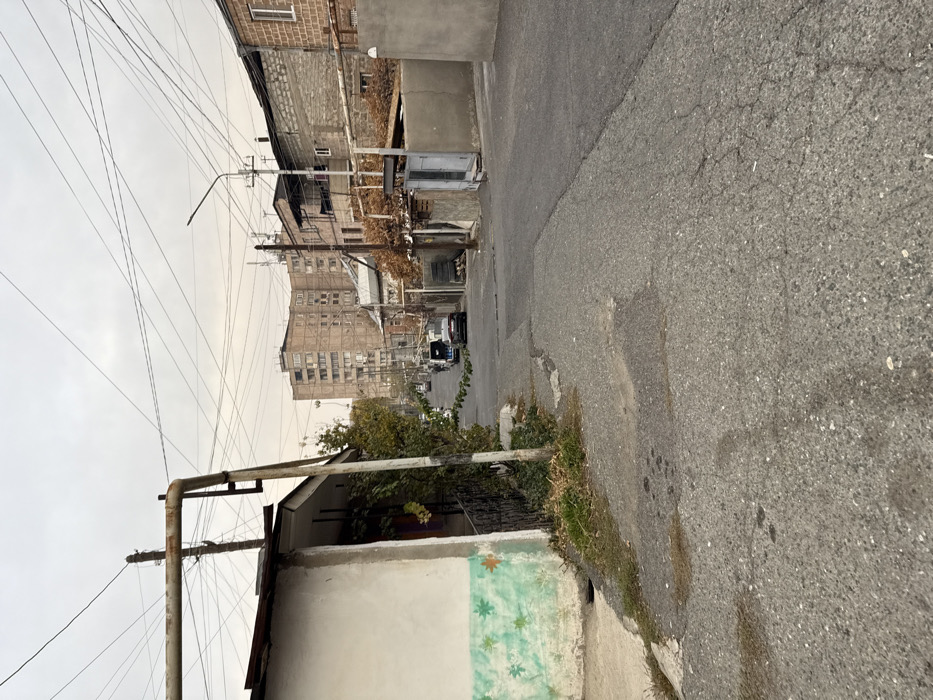 The image depicts a residential street scene in the city of Yerevan, Armenia, under an overcast sky