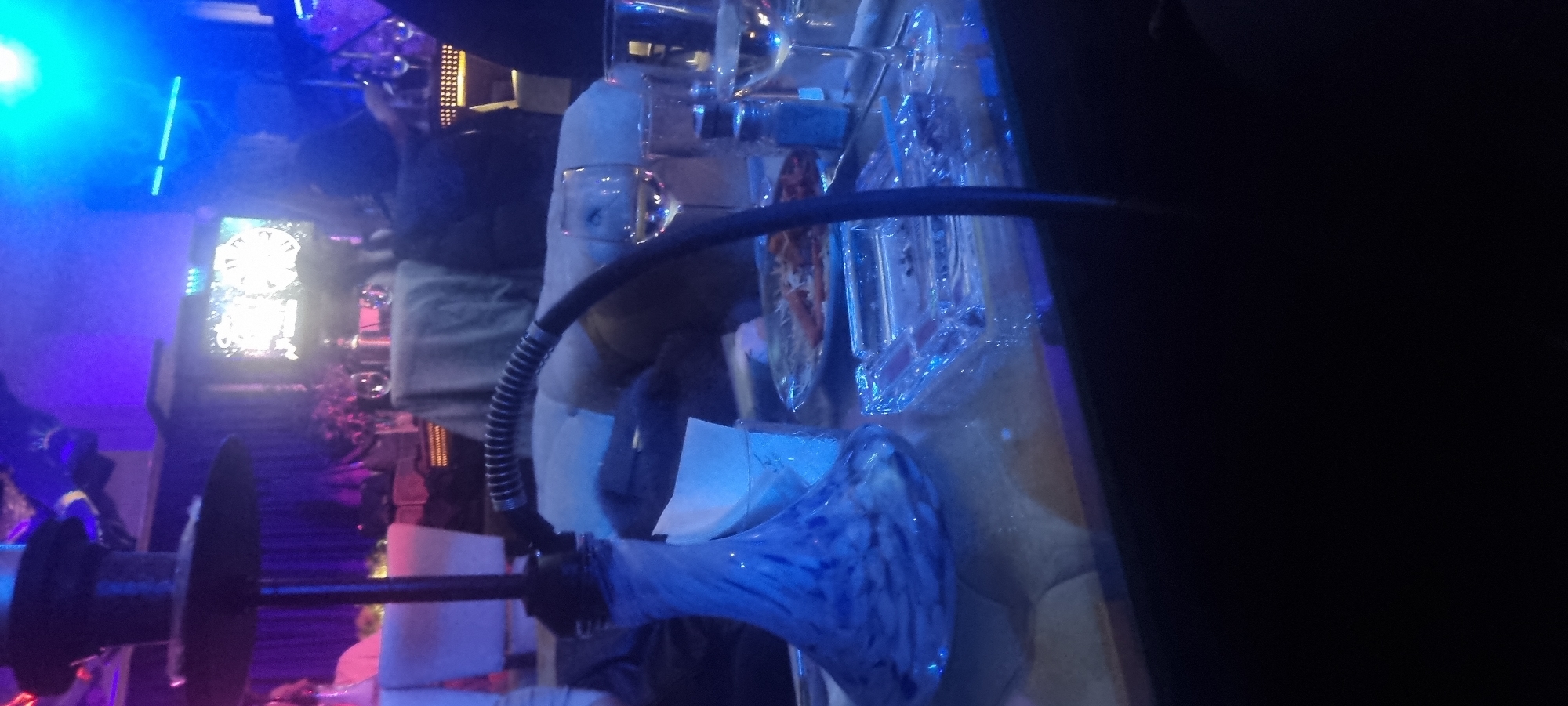 The image displays an indoor scene within a dimly lit establishment, characterized by prominent blue and purple ambient lighting. In the left foreground, a dark-stemmed hookah with a mottled blue glass base stands on a reflective glass tabletop. A dark, flexible hose extends from the hookah, traversing the table towards the right side of the frame. On the table surface, to the right of the hookah and beneath its hose, a clear rectangular glass ashtray is visible, containing a discarded cigarette butt. Adjacent to this, a plate holds food items, appearing to be pasta or similar small dishes, lightly topped with a granular substance. Several drinking glasses are present, including a wine glass containing a small volume of light-colored liquid, and other transparent tumblers or glasses. A small, silver-capped shaker, consistent with a salt or pepper dispenser, is also positioned on the table. In the mid-ground and background, multiple individuals are seated at various tables, their forms largely blurred due to focus and low light conditions. One person is partially discernible to the right of the foreground objects, seated in what appears to be a cushioned chair. Further back, a large screen or television displays a brightly illuminated, detailed graphic, resembling a dartboard or a complex geometric pattern. Tables covered with drapes and additional seating are visible, along with vague indications of floral arrangements on a table in the deeper background. The environment suggests a lounge, bar, or hookah cafe. Regarding the specific location in Sofia, Bulgaria, the image lacks any identifiable landmarks, street signs, or unique architectural features that would allow for forensic identification of a precise address or neighborhood within the city.