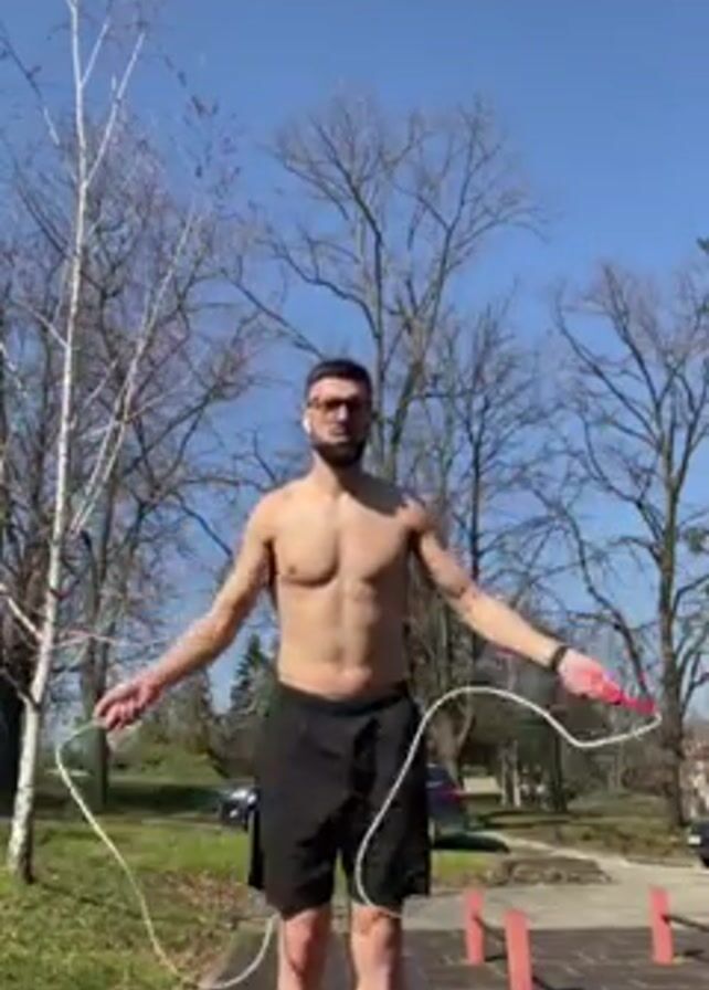 - "A shirtless man wearing black shorts, white socks and shoes, and glasses is jumping rope outside" by FM-v4VIh1, licensed under CC BY 4.0