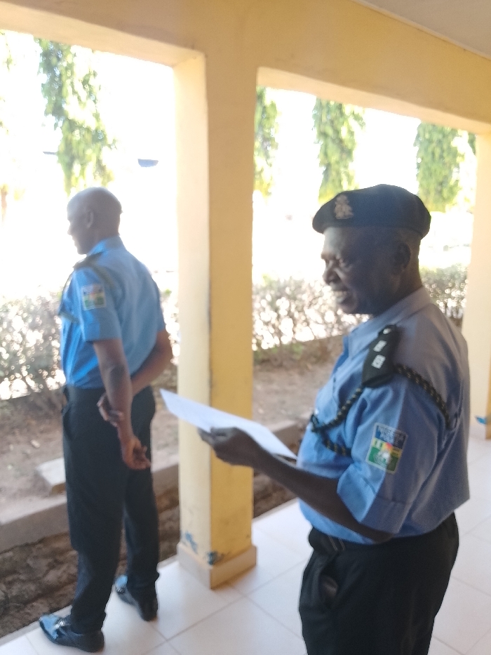 The scene takes place in Kabala, Nigeria, on a white tiled surface under a cream-colored architectural structure, possibly a verandah or covered walkway. In the foreground, an older male Nigerian police officer, wearing a light blue short-sleeved uniform shirt with dark epaulets displaying rank insignia, a dark beret, and dark trousers, holds a white sheet of paper in his right hand. He is looking to his left with a slight smile. Behind him and to the left, a second male Nigerian police officer is seen from his back-left profile. This officer wears a similar light blue uniform shirt with the Nigerian Police Force emblem visible on his left sleeve, dark trousers, and dark shoes. His hands are clasped behind his back, and he is facing left. The background features brightly lit, blurred green foliage and shrubs, indicative of an outdoor, daytime setting.