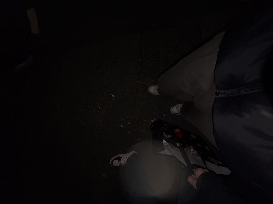 A dimly lit scene shows two pairs of legs and shoes. One person wears white sneakers with black accents. The other wears white sneakers. A patterned reusable shopping bag sits near the first pair of shoes, held by a hand. The ground appears to be a dark, possibly paved, surface. A faint light source illuminates the bottom portion of the frame, highlighting the bag and the first pair of shoes. The darkness obscures most of the background.