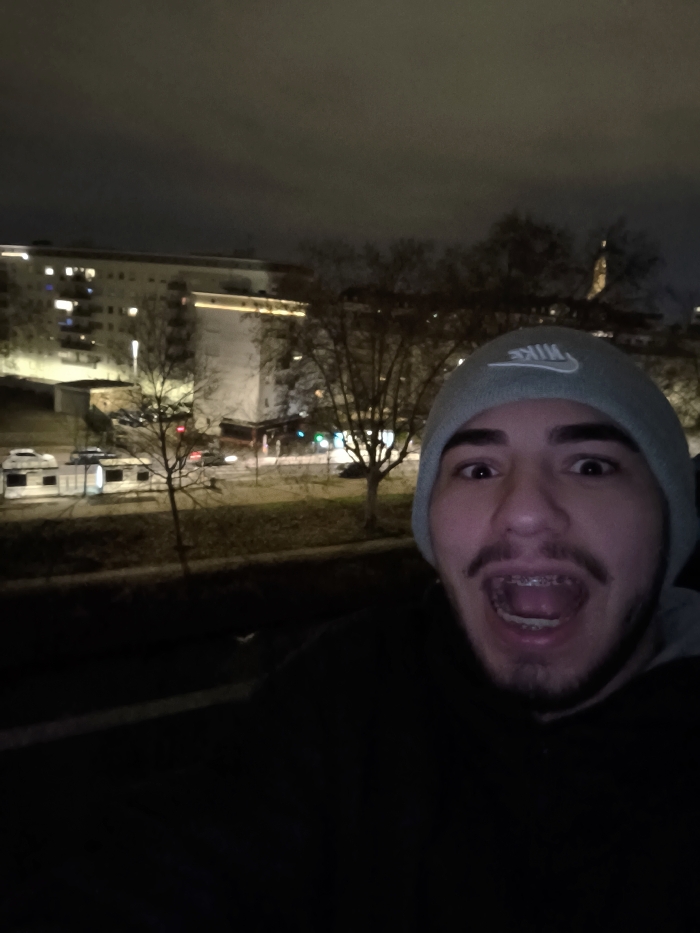 A person wearing a gray Nike beanie takes a selfie at night. They have dark hair, a mustache, a beard, and braces. The background features a cityscape with lit buildings, bare trees, and what appear to be campers parked along the roadside. The sky is dark with a visible cloud cover. The individual has an excited expression with their mouth wide open.