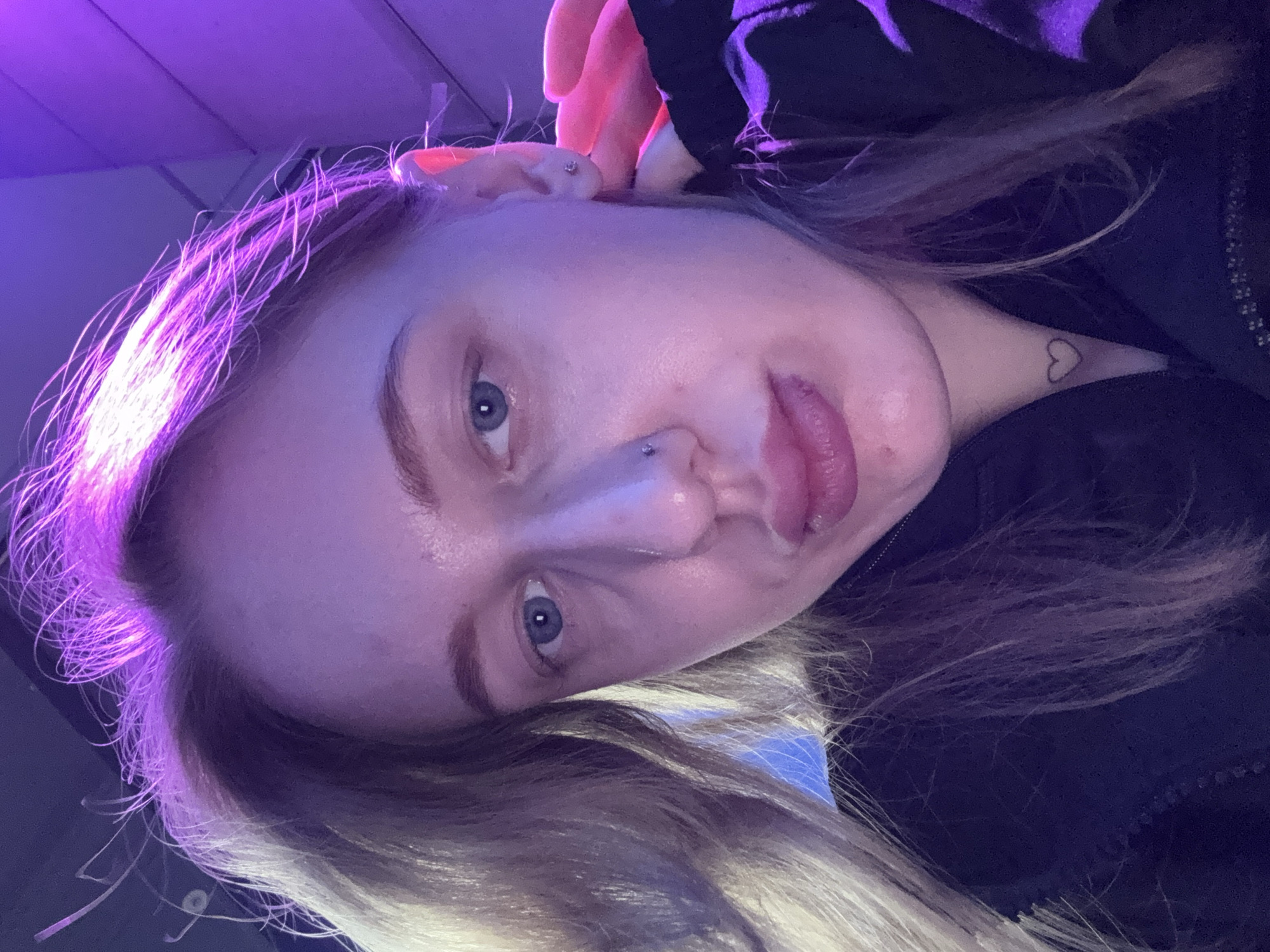 A close-up, tilted selfie depicts a young woman with fair skin and light brown, long hair illuminated by a strong purple/pink light source from the upper left