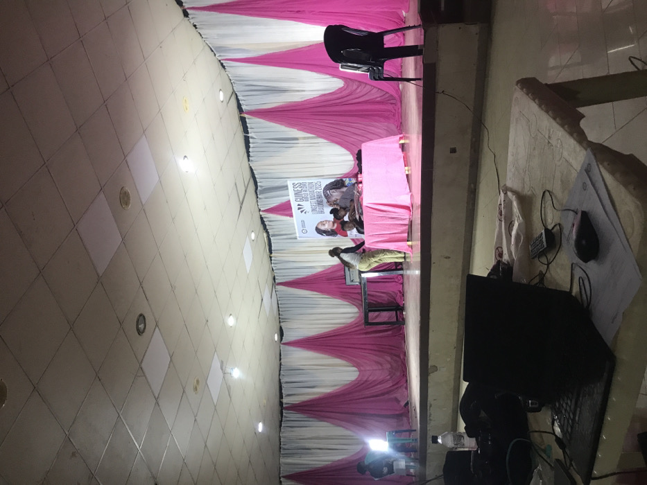 An indoor shot depicts a stage with pink and white drapes. A banner on stage reads "Guinness World Records, Longest Marathon..." People are present behind a pink-draped table on the stage. In the foreground, a table holds a monitor, keyboard, mouse, and other equipment. A water bottle is also visible. A chair sits at the back of the stage. The ceiling has square patterns with recessed lighting.