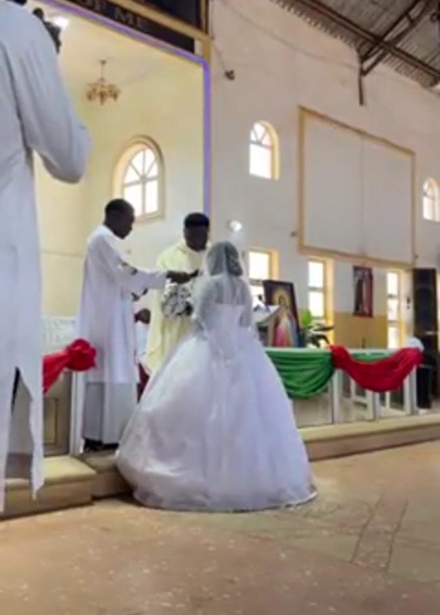 Inside a church, a bride in a white gown and veil stands before two men in clerical robes. One man holds a bouquet of white flowers. The man on the right appears to be speaking, as he gestures toward the bride. A cameraman is visible to the left of the frame, filming the scene. The church interior is simple, with religious imagery adorning the walls and altar. Red and green cloths are draped over the altar railing. The scene appears to capture a moment during a wedding ceremony.