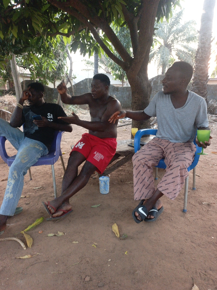 Three men sit outside in plastic chairs under a tree. The man on the left wears a black t-shirt and light blue jeans, looking at his phone. The shirtless man in the middle wears red shorts and gestures with both arms. The man on the right wears a gray t-shirt and Balenciaga printed pants, holding a green glass. A blue and white container sits on the ground next to the man in the red shorts. Leaves and debris are scattered on the ground.