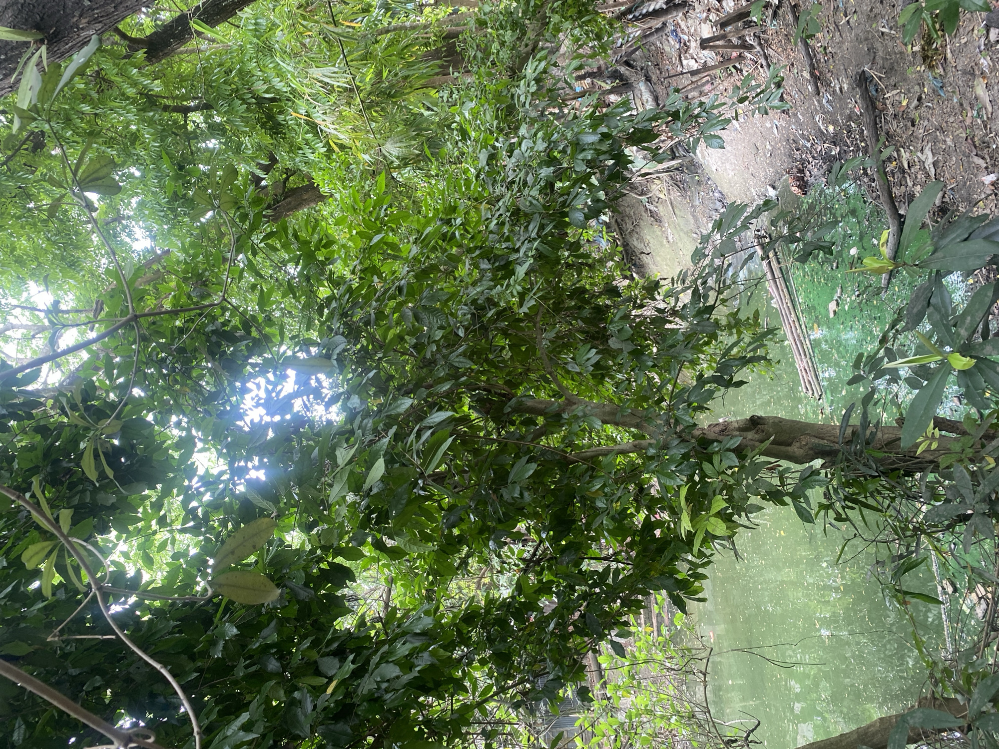 This photograph, taken in an unknown location in Bangladesh, shows a body of stagnant, green-colored water, likely a canal or small pond, viewed through dense foliage. Debris and trash litter the bank of the water feature. The image is oriented in a way that suggests the photographer was positioned at a low angle. The composition is dominated by the green tones of the vegetation and the water. The environment appears unkempt and potentially polluted.