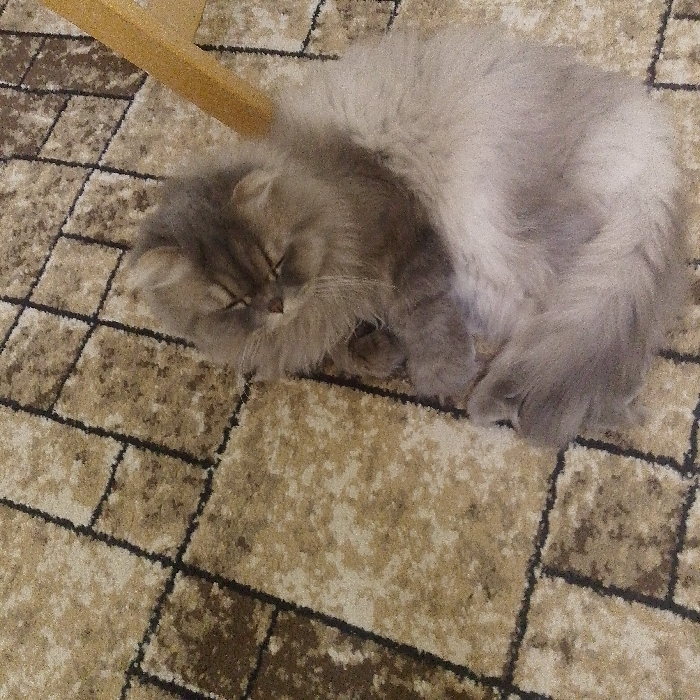 - "A fluffy, gray Persian cat is curled up asleep on a patterned carpet" by FM-o4pOG2, licensed under CC BY 4.0