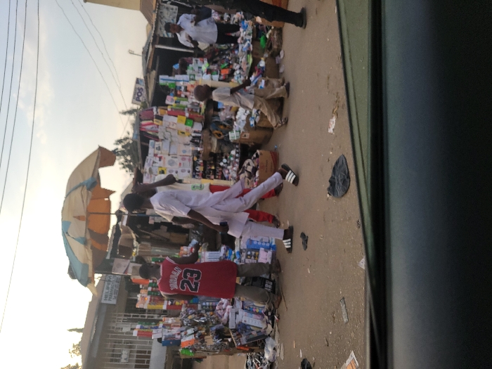 A bustling market scene shows vendors selling an array of goods. Numerous products are stacked and displayed, attracting shoppers along a busy street. People mill around, engaging with sellers. An umbrella provides shade amidst the sunlit atmosphere. Power lines crisscross overhead, contrasting with the market's vibrant commercial activity.