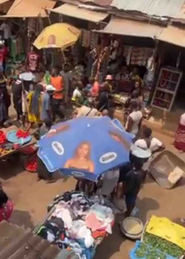 n outdoor marketplace from an elevated perspective. Several people are milling about, some shopping, and others selling items. A table of tomatoes is visible on the left. In the center is an umbrella with a woman's picture on it, sheltering a pile of clothing. Nearby is a table with green vegetables. The market stalls are covered with corrugated metal roofs.