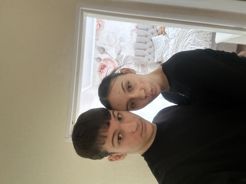 The image depicts two individuals, an adolescent male and an adolescent female, posing closely within an indoor domestic setting