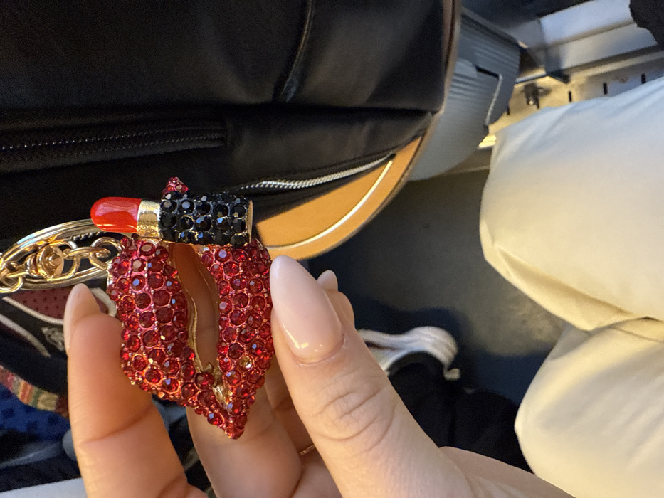 The scene depicts a close-up view of a person's hand holding a keychain, observed within a public transport vehicle in Niederau, Germany. A light-skinned hand with neatly manicured, almond-shaped nails coated in a pale pink polish holds a decorative metal keychain. The keychain features a gold-toned ring and chain, from which two primary charms are suspended: a pair of open lips entirely encrusted with numerous small red faceted stones, and a miniature lipstick tube. The lipstick tube body is similarly encrusted with black faceted stones, while its exposed tip is bright red and smooth. Behind the hand and keychain, a black bag or backpack with a visible metallic zipper and a segment of a light brown or tan lining is partially visible. Below the keychain, the subject's lap is covered by light-colored, possibly off-white, trousers. To the lower right, a dark grey ribbed seat cushion and a metallic base structure, consistent with public transportation seating, are discernible.