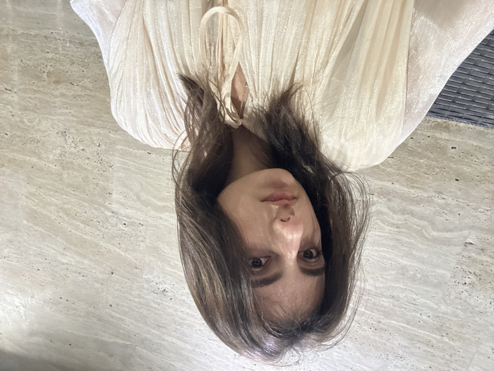 A woman with shoulder-length brunette hair is captured from a high angle. She's wearing a shimmering, light-colored top with a drawstring neckline. Her gaze is directly towards the viewer. The background features a neutral-toned marble surface and a hint of a dark, textured material at the top right corner. The image is rotated, making the perspective slightly disorienting.
